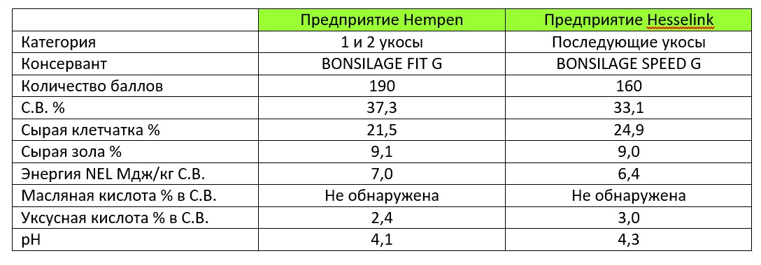Оптимальные сроки уборки и управляемый процесс силосования являются необходимыми предпосылками для получения кормов наилучшего качества. Лабораторные анализы кормов показывают, что применение консервантов Bonsilage способствовало получению высококачественных кормов. Достигнутые уровни рН (образование молочной кислоты) и достаточное образование уксусной кислоты (стабильность кормов) возможны только при применении правильного консерванта. Это подтверждается первыми местами, занятыми с Соревновании по силосованию 2017 при участии Сельскохозяйственной палата Нижней Саксонии.